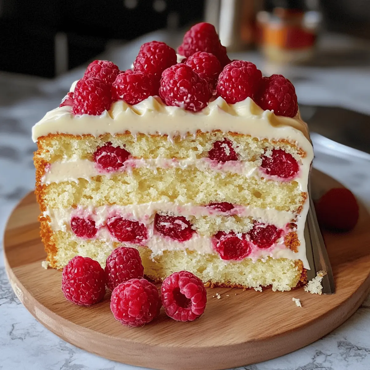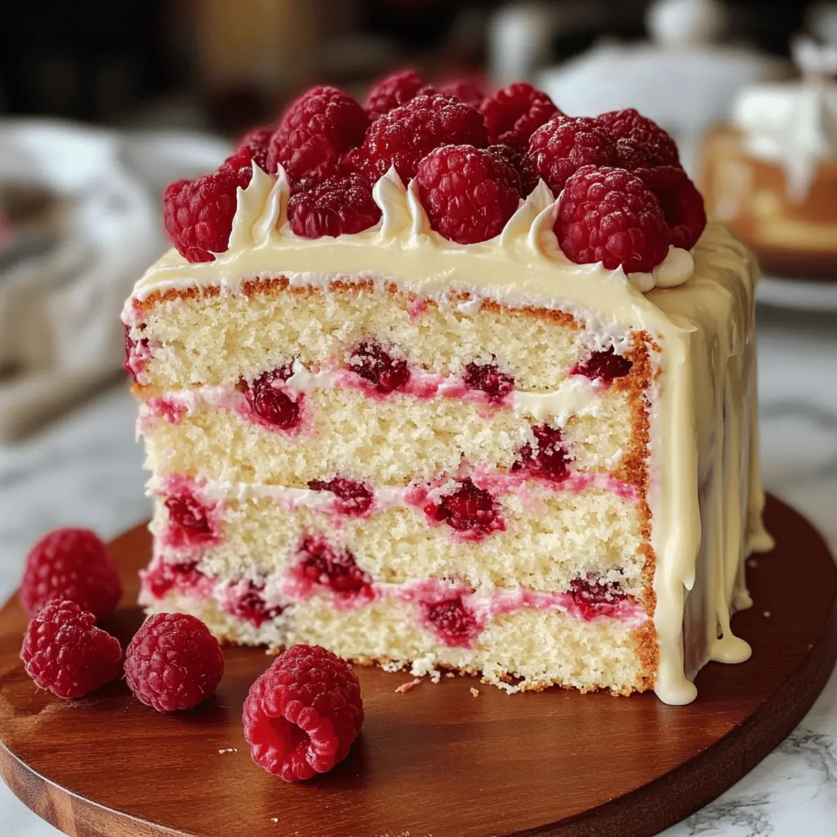 11. Verziere den abgekühlten Kuchen mit der Glasur und frischen Himbeeren.