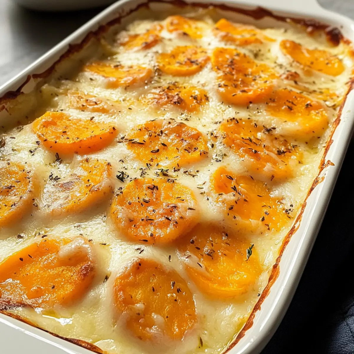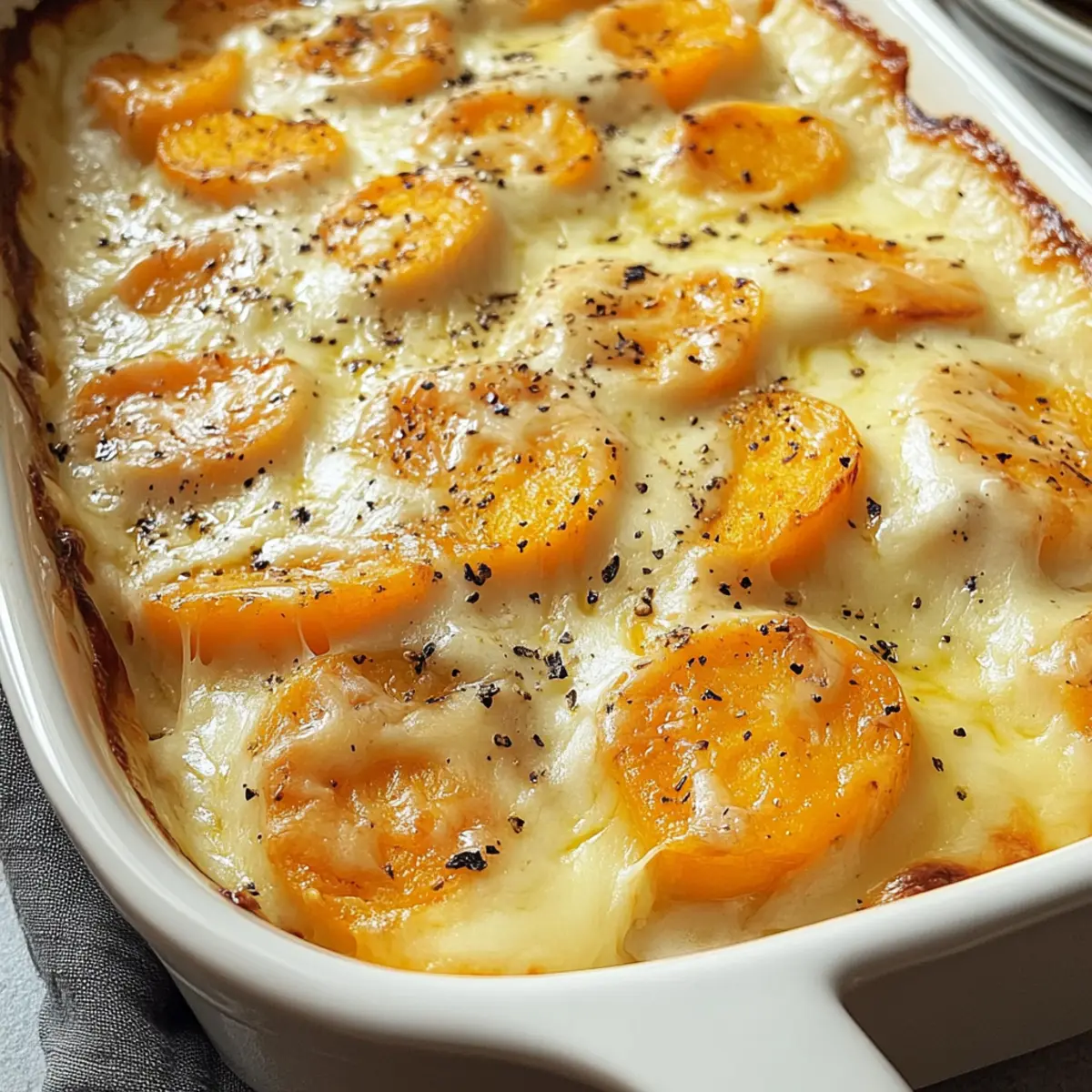 Was für ein Glücksfall, als ich beim Stöbern in alten Familienrezepten auf meinen geliebten Weißen und Süßen Kartoffelauflauf stieß! Die Kombination aus sahnigen, in Butter geschichteten Kartoffeln und der süßen Note der Süßkartoffeln hat einen ganz besonderen Platz in meinem Herzen. Dieses Rezept bringt nicht nur Komfort auf den Tisch, sondern überzeugt auch mit schnellem Zubereiten und abwechslungsreichen Variationsmöglichkeiten. Ideal für jede Familienfeier oder ein entspanntes Abendessen unter Freunden – dieser Auflauf wird zum Star Ihres nächsten Festmahls. Wer könnte da widerstehen? Lassen Sie uns gemeinsam entdecken, wie Sie dieses köstliche Gericht zubereiten können! Warum werden Sie dieses Rezept lieben? Vielfältige Zubereitungsmöglichkeiten: Mit weißen und süßen Kartoffeln kreieren Sie eine spannende Geschmackskombination, die jedem Gericht einen einzigartigen Twist verleiht. Schnelle Zubereitung: Der Auflauf ist einfach und benötigt nur grundlegende Kochfähigkeiten, perfekt für hektische Wochentage oder spontane Dinnerpartys. Bequemlichkeit: Ideal für Familienfeiern, da er sich problemlos vorbereiten lässt und Ihre Gäste beeindrucken wird. Köstlicher Komfort: Die cremige Textur und der schmelzende Käse bieten pure Gaumenfreude, die das Herz erwärmt. Gesunde Alternativen: Experimentieren Sie mit verschiedenen Käsesorten oder fügen Sie etwas Gemüse hinzu, um Ihre eigene Note zu setzen. Entdecken Sie weitere köstliche Möglichkeiten mit unseren Variationen für Kartoffelaufläufe. Zutaten für Weiße und Süße Kartoffelauflauf • Entdecken Sie die perfekten Zutaten für einen köstlichen Kartoffelauflauf, der jedem Fest einen Hauch von Komfort verleiht. Für die Kartoffeln Weiße Kartoffeln – sind die Grundlage dieses Gerichts und sorgen für eine cremige Textur. Verwenden Sie 2 große, geschälte und dünn geschnittene Kartoffeln. Süße Kartoffeln – bringen eine natürliche Süße ins Spiel, die das Gericht ausgleicht. Verwenden Sie 2 große, geschälte und dünn geschnittene Süßkartoffeln. Für die Soße Schlagsahne – sorgt für die cremige Soße und kann durch Halb-und-Halb ersetzt werden. Verwenden Sie 2 Tassen. Knoblauch – verstärkt den Geschmack der Soße. Verwenden Sie 2 Zehen, fein gehackt. Salz – ist essentiell für den Geschmack. Verwenden Sie 1 Teelöffel. Schwarzer Pfeffer – verleiht eine subtile Schärfe. Verwenden Sie 1 Teelöffel. Thymian – bringt herzhafte Noten ins Gericht. Verwenden Sie 1 Teelöffel, frisch oder getrocknet. Für den Käse Cheddar Käse – sorgt für intensiven Geschmack und köstliche Käsegüte. Verwenden Sie 1 Tasse, gerieben. Mozzarella Käse – verleiht Schmelz und Cremigkeit. Verwenden Sie 1 Tasse, gerieben. Für die Zubereitung Butter – sorgt dafür, dass die Backform gleichmäßig gebräunt wird. Verwenden Sie 2 Esslöffel. Schritt-für-Schritt-Anleitung für Weiße und Süße Kartoffelauflauf Step 1: Ofen vorheizen Heizen Sie den Ofen auf 190°C (375°F) vor und fetten Sie eine Auflaufform mit 2 Esslöffeln Butter ein. Achten Sie darauf, dass die Form gut geölt ist, damit die Kartoffeln beim Backen nicht anhaften. Dies sorgt für eine gleichmäßige Bräunung und eine schöne, goldene Kruste auf Ihrem Weißen und Süßen Kartoffelauflauf. Step 2: Soße zubereiten In einer Schüssel verquirlen Sie 2 Tassen Schlagsahne mit 2 fein gehackten Knoblauchzehen, 1 Teelöffel Salz, 1 Teelöffel schwarzem Pfeffer und 1 Teelöffel Thymian. Rühren Sie die Mischung gründlich um, bis alle Zutaten gut miteinander verbunden sind. Diese cremige Soße wird später gleichmäßig über die Kartoffelschichten gegossen und sorgt für einen reichhaltigen Geschmack. Step 3: Kartoffeln schichten Legen Sie die dünn geschnittenen weißen und süßen Kartoffeln abwechselnd in die vorbereitete Auflaufform. Achten Sie darauf, sie gleichmäßig zu verteilen, damit jede Schicht gut belegt ist. Diese Anordnung wird dafür sorgen, dass die Aromen im Weißen und Süßen Kartoffelauflauf schön ineinanderfließen und jeder Biss ein Genuss wird. Step 4: Soße hinzufügen Gießen Sie die vorbereitete Sahne-Knoblauch-Mischung gleichmäßig über die geschichteten Kartoffeln. Stellen Sie sicher, dass alle Kartoffeln gut mit der Soße bedeckt sind, um eine gleichmäßige Garung zu gewährleisten. Diese cremige Grundlage ist entscheidend, damit der Auflauf beim Backen die perfekte Konsistenz erreicht. Step 5: Käse bestreuen Streuen Sie großzügig 1 Tasse geriebenen Cheddar und 1 Tasse geriebenen Mozzarella gleichmäßig über die oberste Schicht der Kartoffeln. Diese Käseschicht sorgt für eine köstlich geschmolzene und goldene Kruste. Die Mischung aus Cheddar und Mozzarella wird dem Weißen und Süßen Kartoffelauflauf zusätzlichen Geschmack und eine wunderbare Textur verleihen. Step 6: Abdecken und backen Decken Sie die Auflaufform mit Aluminiumfolie ab und schieben Sie sie in den vorgeheizten Ofen. Backen Sie den Auflauf für 45 Minuten, damit die Kartoffeln dampfen und weich werden. Das Abdecken sorgt dafür, dass die Feuchtigkeit im Gericht bleibt und die Aromen gut verteilt werden. Step 7: Backen ohne Folie Entfernen Sie nach 45 Minuten die Folie und backen Sie den Auflauf für weitere 15 Minuten, bis die Oberseite goldbraun und sprudelnd ist. Achten Sie darauf, dass die Käseschicht schön gebräunt ist und der Auflauf an den Rändern leicht blubbernd aussieht – das ist der perfekte Zeitpunkt, um ihn aus dem Ofen zu nehmen. Step 8: Abkühlen lassen Lassen Sie den Weißen und Süßen Kartoffelauflauf einige Minuten ruhen, bevor Sie ihn servieren. Dies hilft, die Aromen zu setzen und erleichtert das Schneiden in Stücke. Genießen Sie die köstliche Kombination aus cremigen Kartoffeln und geschmolzenem Käse bei Ihrem nächsten Festmahl! Expertentipps für Weiße und Süße Kartoffelauflauf Vorbereitung ist Schlüssel: Schneiden Sie die Kartoffeln im Voraus und lagern Sie sie in Zitronenwasser, um ein B
