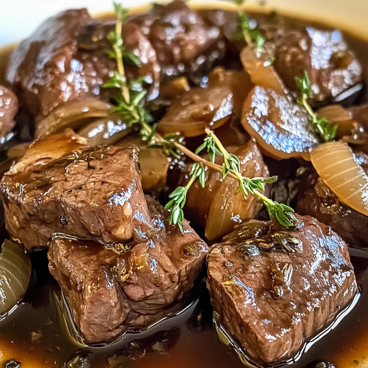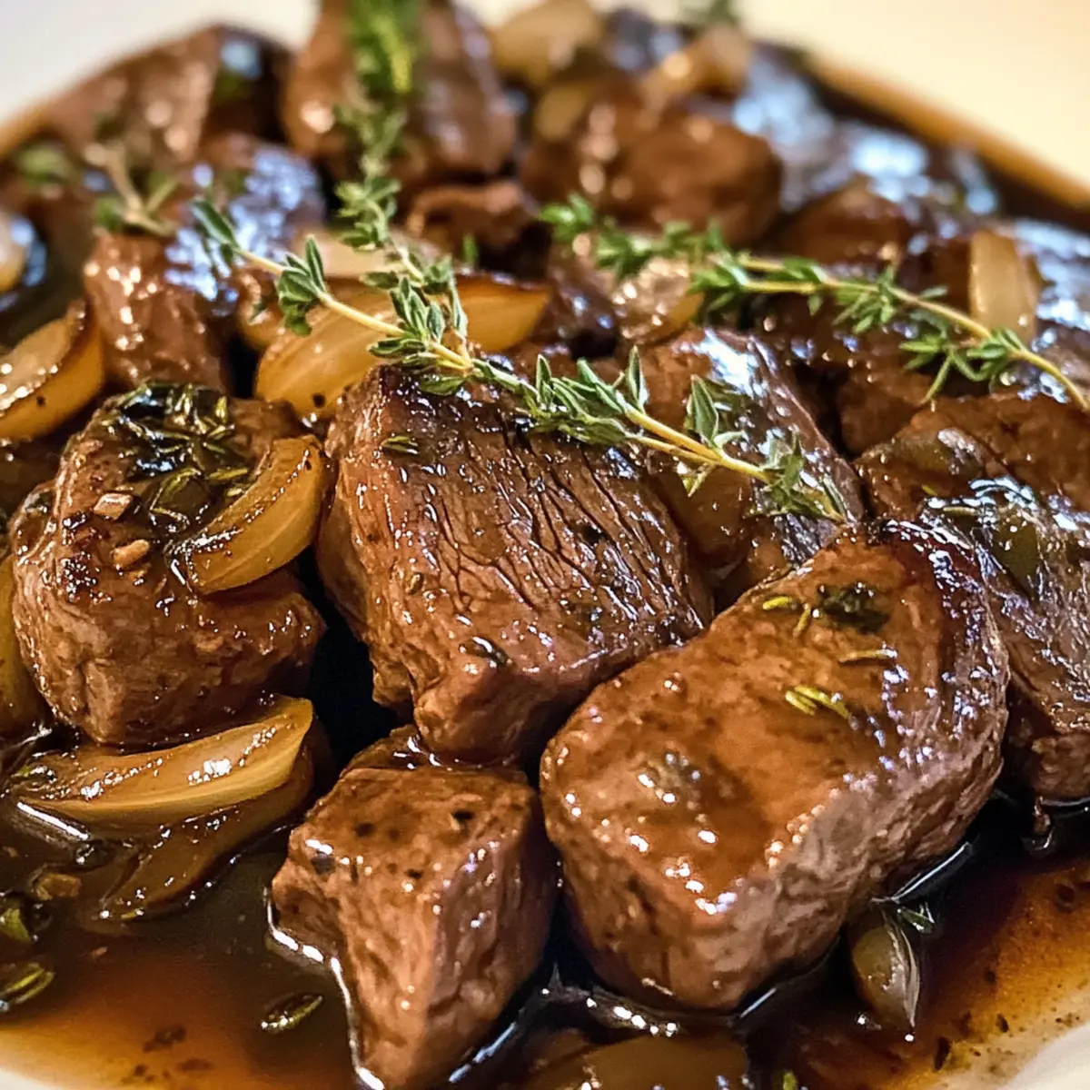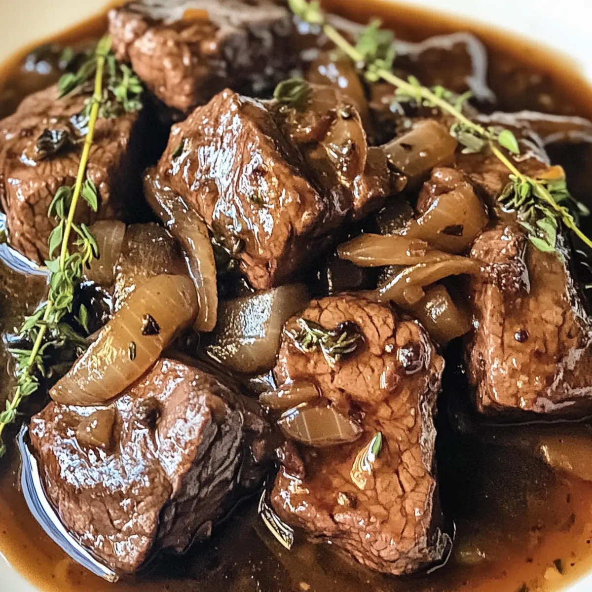 Die Küche verwandelt sich in ein wahres Aromafeuerwerk, wenn zartes Rindfleisch in aromatischer Balsamico-Zwiebel-Sauce auf dem Herd schmort. Die Kombination aus saftigem Fleisch und der verführerischen Süße karamellisierter Zwiebeln bringt nicht nur den Gaumen zum Tanzen, sondern ist auch eine umwerfende Option für gesellige Abende oder ein gemütliches Familienessen. Zudem erfordert diese einfache und glutenfreie Zubereitung keinerlei Kochzauber, sodass auch Anfänger schnell zum Ergebnis kommen, das jeder lieben wird. Ich kann mir kaum einen besseren Weg vorstellen, um den Stress des Alltags hinter sich zu lassen und in die Welt der herzhaften Geschmäcker einzutauchen. Bist du bereit, das Geheimnis hinter diesem köstlichen Gericht zu entdecken? Warum wirst du dieses Rindfleisch lieben? Einfachheit, die begeistert: Diese Rezeptur für zartes Rindfleisch in aromatischer Balsamico-Zwiebel-Sauce ist unkompliziert und erfordert nur grundlegende Kochkenntnisse. Intensive Aromen: Die harmonische Kombination aus Balsamico und karamellisierten Zwiebeln sorgt für ein wahres Geschmacksfeuerwerk. Vielseitig, das Gericht lässt sich perfekt mit verschiedenen Beilagen wie Kartoffelpüree oder Risotto kombinieren. Zeitersparnis: Dank der langen Schmorzeit erledigt sich die Zubereitung praktisch von selbst. Familienfreundlich – jeder wird diese Gaumenfreude lieben! Wenn du mehr köstliche Gerichte entdecken möchtest, schau dir auch unsere Anleitung zum Schmoren von Rindfleisch an. Zartes Rindfleisch in Balsamico-Zwiebel-Sauce Zutaten • Entdecke die Geheimnisse der Aromen! Für das Rindfleisch Rindfleisch – Zartes Stück Rindfleisch sorgt für eine saftige Basis, wähle frisches, hochwertiges Fleisch für den besten Geschmack. Für die Sauce Zwiebeln – Karamellisierte Zwiebeln bringen Süße und Tiefe in die Sauce. Knoblauch – Fügt eine aromatische Dimension hinzu und bereichert das Geschmacksprofil. Balsamico-Essig – Sorgt für die charakteristische süß-saure Note der Sauce, die das Gericht einzigartig macht. Olivenöl – Zum Anbraten des Rindfleisches und der Zwiebeln, um die Aromen zu entfalten. Frischer Thymian – Für aromatischen Geschmack und als schöne Garnierung. Salz und Pfeffer – Zum Würzen des Fleisches, unverzichtbar für den perfekten Geschmack. Mit diesen Zutaten wirst du zartes Rindfleisch in aromatischer Balsamico-Zwiebel-Sauce genießen und deine Liebsten beeindrucken! Schritt-für-Schritt-Anleitung zum Zarten Rindfleisch in aromatischer Balsamico-Zwiebel-Sauce genießen Step 1: Rindfleisch vorbereiten Das zarte Rindfleisch gründlich unter kaltem Wasser abspülen und mit Küchenpapier abtrocknen. großzügig mit Salz und frisch gemahlenem Pfeffer würzen, um dem Fleisch eine intensive Geschmacksbasis zu geben. Dies ist wichtig, damit das Rindfleisch beim Anbraten die Aromen gut aufnimmt und gleichmäßig gart. Step 2: Rindfleisch anbraten In einem großen Schmortopf das Olivenöl bei mittlerer Hitze erhitzen. Sobald das Öl heiß ist, das gewürzte Rindfleisch in den Topf legen und rundum 5-7 Minuten anbraten, bis es eine goldene Kruste hat. Dadurch wird das Fleisch versiegelt, und die Saftigkeit bleibt beim Schmoren erhalten. Nach dem Anbraten das Rindfleisch herausnehmen und beiseitelegen. Step 3: Zwiebeln karamellisieren Im gleichen Topf die zuvor herausgenommene Flüssigkeit nutzen und die geschnittenen Zwiebeln hinzugeben. Diese bei mittlerer Hitze 5-7 Minuten anbraten, bis sie weich und goldbraun sind. Achte darauf, regelmäßig zu rühren, damit die Zwiebeln gleichmäßig karamellisieren. Der Duft wird köstlich sein und die Aromen entfalten sich perfekt für die Balsamico-Zwiebel-Sauce. Step 4: Knoblauch hinzufügen Wenn die Zwiebeln schön karamellisiert sind, den fein gehackten Knoblauch hinzufügen und für 1-2 Minuten mitbraten. Der Knoblauch sollte gerade anfangen, goldbraun zu werden, um ein unangenehmes Anbrennen zu vermeiden. Diese Aromenkombination wird dem zarten Rindfleisch in aromatischer Balsamico-Zwiebel-Sauce eine zusätzliche Geschmacksdimension verleihen. Step 5: Balsamico-Essig einfüllen Den Balsamico-Essig in den Topf geben und die Mischung gut umrühren. Lass alles für 2-3 Minuten köcheln, sodass der Essig etwas reduziert wird und sich mit den Aromen der Zwiebeln und des Knoblauchs verbindet. Die süß-sauren Noten des Essigs bringen einen tollen Kontrast zum zarten Rindfleisch. Step 6: Rindfleisch wieder hinzufügen Das angebratene Rindfleisch in den Topf zurückgeben und frischen Thymian hinzufügen. Achte darauf, das Fleisch mit der aromatischen Sauce gut zu vermengen, sodass es sich mit dem Balsamico-Geschmack verbindet. Diese Schritte sind entscheidend, um das zarte Rindfleisch in aromatischer Balsamico-Zwiebel-Sauce zu perfektionieren. Step 7: Schmoren lassen Den Deckel auf den Schmortopf setzen, die Hitze reduzieren und das Gericht 2-3 Stunden sanft schmoren lassen. Die langjährige Kochzeit ermöglicht es den Aromen, tief in das Rindfleisch einzuziehen und es zart und saftig zu machen. Das Geduldsspiel wird sich später mit einem unvergleichlichen Geschmack auszahlen. Step 8: Rindfleisch servieren Nach der Schmorzeit das Rindfleisch vorsichtig herausnehmen und in Stücke schneiden. Mit der aromatischen Balsamico-Zwiebel-Sauce übergießen und nach Belieben mit frischem Thymian garnieren. Dieses zarte Rindfleisch in aromatischer Balsamico-Zwiebel-Sauce genießen, und sich auf das Kompliment deiner Gäste freuen! Lagerungstipps für Zartes Rindfleisch in aromatischer Balsamico-Zwiebel-Sauce Raumtemperatur: Die Zubereitung sollte nach dem Kochen nicht länger als 2 Stunden bei Raumtemperatur stehen gelassen werden, um die Sicherheit zu gewährleisten. Kühlschrank: Reste des zarten Rindfleischs in einem luftdichten Behälter aufbewahren und innerhalb von 3 bis 4 Tagen genießen. Dies bewahrt den Geschmack der Balsamico-Zwiebel-Sauce. Gefrierschrank: Für eine längere Lagerung kann das Gericht bis zu 3 Monate eingefro