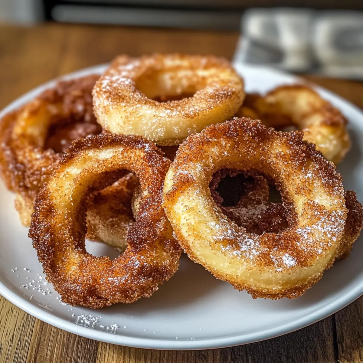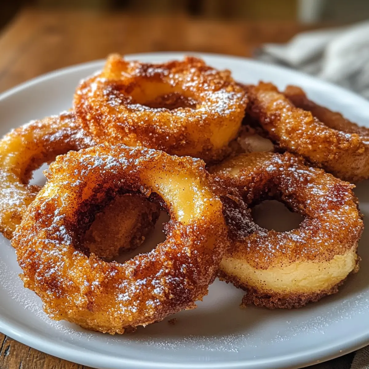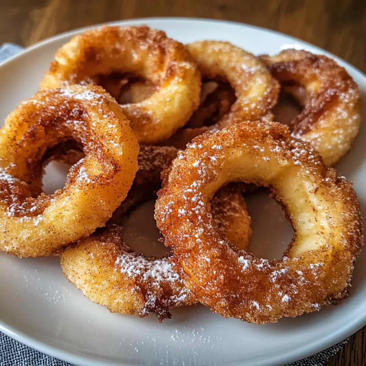 Es war ein nebliger Herbstabend, und der verführerische Duft von Zimt hing in der Luft, als ich in meiner Küche stand und mich auf das große Experiment vorbereitete: Zimtapfelringe aus der Heißluftfritteuse. Schnelle und einfache Desserts sind meine Vorliebe, und diese luftigen, knusprigen Ringe sind perfekt für jede Gelegenheit. Der süße Zimt-Zucker-Mantel umschließt zarte Apfelringe, die beim Bissen einen harmonischen Kontrast aus Knusprigkeit und Saftigkeit bieten. Diese leckeren Zimtapfelringe sind nicht nur ein schöner Anblick, sie sind auch ein echter Publikumsliebling – ideal, um Familie und Freunde zu den Tisch zu rufen, ohne den ganzen Abend in der Küche zu verbringen. Wer könnte da widerstehen? Lass mich dir zeigen, wie einfach es ist, diesen köstlichen Genuss zuzubereiten! Warum sind diese Zimtapfelringe ein Hit? Einfachheit, die begeistert: Mit nur wenigen Grundzutaten zauberst du im Handumdrehen ein leckeres Dessert. Aromatischer Genuss: Der süße Zimt-Zucker-Mantel verwandelt knackige Apfelringe in einen vollwertigen Genuss. Vielseitig, da du sie nach Belieben mit Joghurt, Karamell oder auch Eis servieren kannst. Schnell servierfertig: In der Heißluftfritteuse garen sie in weniger als 10 Minuten. Familienfreundlich: Perfekt für Groß und Klein, wird dieses Rezept deine Angehörigen erfreuen und spannende Gespräche am Tisch fördern. Zutaten für Zimtapfelringe aus der Heißluftfritteuse • Für die Äpfel Äpfel – Die Hauptzutat, die Süße und Struktur liefert. Verwende feste Sorten wie Honeycrisp oder Gala für besten Genuss. • Für den Teig Ei – Dient als Bindemittel für die Panade. Kann durch ein Leinsamen-Ei als vegane Option ersetzt werden. Milch – Sorgt für eine glatte Eimischung. Jede Milchvariante oder pflanzliche Milch ist möglich für besondere Bedürfnisse. Allzweckmehl – Bildet die erste Schicht der Panade. Verwandele es in glutenfreies Mehl für eine glutenfreie Variante. • Für den Zimt-Zucker-Mantel Zimt und Zucker Mischung – Fügt den charakteristischen Geschmack und Süße hinzu. Passen die Zuckermenge nach Belieben an; weniger Süße kannst du erzielen, indem du es weglässt oder reduzierst. • Sonstiges Kochspray – Verhindert das Ankleben in der Heißluftfritteuse. Greife auf ein gesundes Ölspray zurück, wenn gewünscht. Diese Zimtapfelringe aus der Heißluftfritteuse sind eine wunderbare Möglichkeit, die herbstlichen Aromen zu genießen und gleichzeitig eine gesunde und leckere Dessertoption zu bieten! Schritt-für-Schritt-Anleitung für Zimtapfelringe aus der Heißluftfritteuse Step 1: Äpfel vorbereiten Wasche die Äpfel gründlich, trockne sie ab und entferne das Kerngehäuse. Schneide die Äpfel in ¼-Zoll dicke Ringe. Achte darauf, die Ringe gleichmäßig zu halten, damit sie gleichmäßig garen und die knusprigen Zimtapfelringe aus der Heißluftfritteuse perfekt werden. Step 2: Apfelscheiben trocken Trockne die Apfelscheiben gründlich mit einem Küchentuch, um sicherzustellen, dass die Panade gleichmäßig haftet. Wenn die Apfelscheiben feucht sind, kann die Panade nicht richtig anhaften, was die Knusprigkeit der Ringe beeinträchtigt. Step 3: Dip-Station einrichten Bereite drei Schalen vor: eine mit Allzweckmehl, eine mit einem Eimischung (verquirltes Ei und Milch) und eine mit der Zimt-Zucker-Mischung. Diese Anordnung erleichtert das Beschichten der Apfelringe und sorgt dafür, dass jeder Schritt schnell vonstattengeht. Step 4: Apfelringe panieren Nimm einen Apfelring und tauche ihn zuerst in das Mehl, sodass er vollständig bedeckt ist. Tauche ihn dann in die Eimischung und schließlich in die Zimt-Zucker-Mischung, bis er gleichmäßig bedeckt ist. Wiederhole diesen Vorgang mit allen Apfelringen, um herrliche Zimtapfelringe aus der Heißluftfritteuse zu kreieren. Step 5: In der Heißluftfritteuse anordnen Heize die Heißluftfritteuse auf 190 °C vor. Lege die panierten Apfelringe in einer einzigen Schicht in den Korb, wobei du darauf achtest, den Luftstrom nicht zu blockieren. Eine gleichmäßige Anordnung sorgt dafür, dass die Ringe knusprig und goldbraun werden. Step 6: Frittieren Lass die Apfelringe für 6-8 Minuten in der Heißluftfritteuse garen. Wende die Ringe nach der Hälfte der Garzeit vorsichtig, um eine gleichmäßige Bräunung und Knusprigkeit zu erreichen. Sie sollten goldbraun und knusprig sein, wenn sie fertig sind. Step 7: Servieren Lass die Zimtapfelringe kurz abkühlen, bevor du sie servierst. Genieße sie warm, eventuell mit einem Staubzucker oder einem Honig-Dip, um das Geschmackserlebnis noch zu verbessern. Diese köstlichen Apfelringe sind ein echter Genuss und ideal für jede Gelegenheit. Was passt zu Zimtapfelringen aus der Heißluftfritteuse? Genießen Sie eine köstliche Kombination, die die Aromen und Texturen Ihrer knusprigen Zimtapfelringe wunderbar ergänzt. Vanilleeis: Eine Kugel cremiges Eis sorgt für einen himmlischen Kontrast zu den warmen, knusprigen Ringen und verstärkt das Geschmackserlebnis. Griechischer Joghurt: Der cremige und leicht saure Joghurt bietet eine erfrischende Balance zur Süße der Zimtapfelringe, ideal für ein gesundes Dessert. Karamellsauce: Ein warmer Karamellüberzug verstärkt das Aroma und sorgt für das gewisste Extra, das jede Portion unvergesslich macht. Kaffee oder Tee: Ein belebender Kaffee oder ein aromatischer Tee ergänzen die süßen Aromen der Zimtapfelringe perfekt und laden zu einer gemütlichen Nachmittagsrunde ein. Zimt- oder Kakaopulver: Ein leichtes Bestäuben mit Zimt oder Kakao bietet nicht nur eine hübsche Präsentation, sondern intensiviert auch die Geschmacksnoten der Ringe. Pekannüsse: Gestiftete oder gehackte Pekannüsse fügen eine nussige Crunch-Note hinzu, die das Dessert noch aufregender macht. Diese Kombinationen machen Ihre Zimtapfelringe aus der Heißluftfritteuse zu einem unvergesslichen Dessert! Lagerung und Einfrieren von Zimtapfelringen aus der Heißluftfritteuse Kühlschrank: Bewahre die übrig gebliebe
