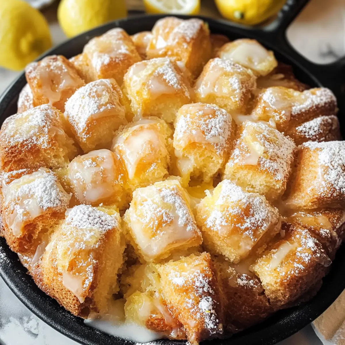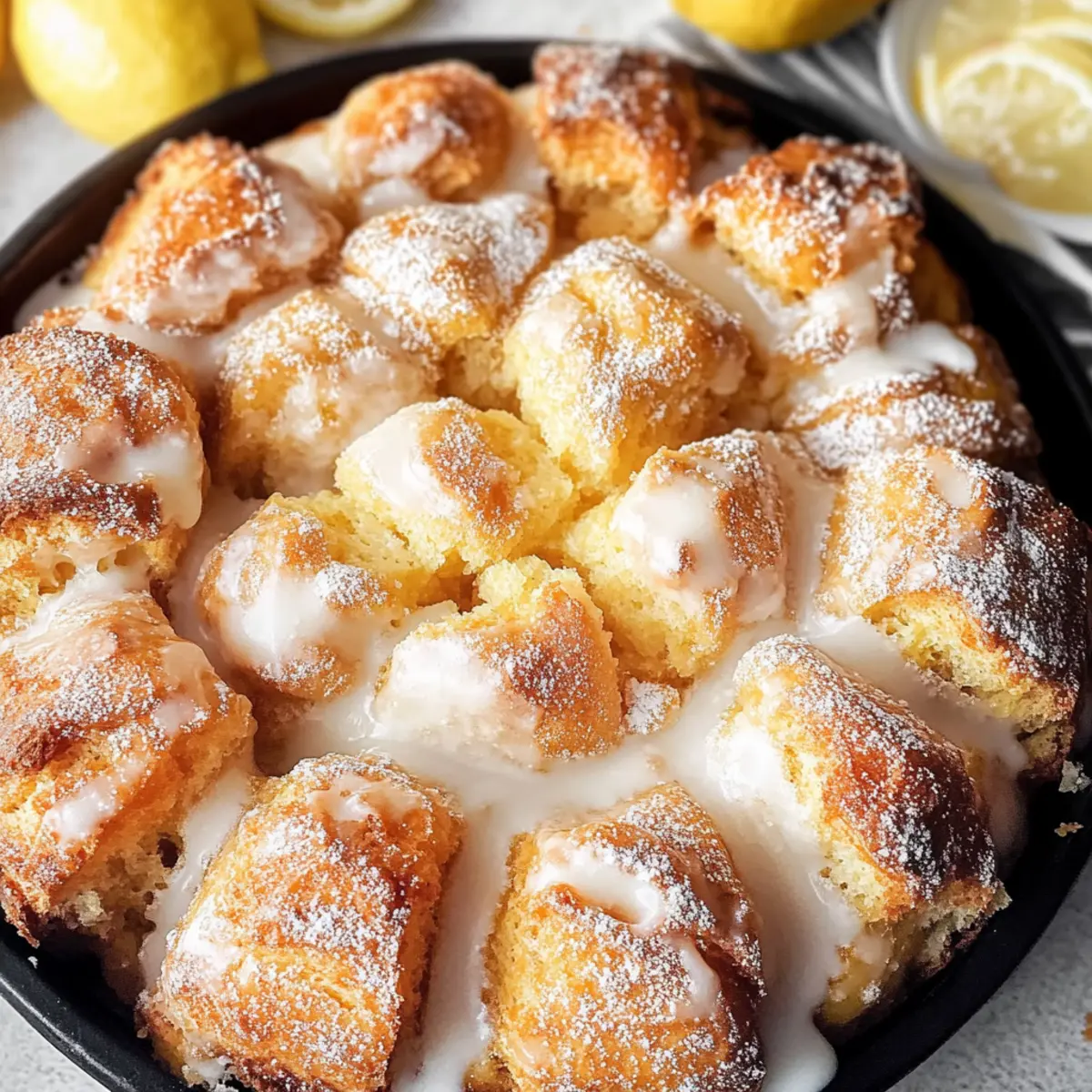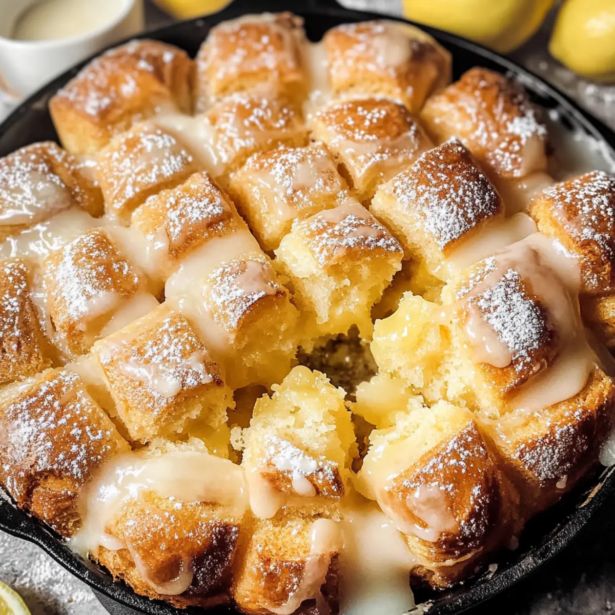 Ein frischer Duft von Zitrusfrüchten durchzieht meine Küche, während ich mich auf die Zubereitung meines Zitronen Affenbrotes vorbereite. Diese besondere Variante des klassischen Monkey Breads verwandelt die vertraute, weiche Textur in ein erfrischendes Geschmackserlebnis, das perfekt für jede saisonale Zusammenkunft ist. Die kleinen Teigkugeln, die in einer süßen Zitronenbuttermarinade getränkt sind und mit einer einfachen Glasur verziert werden, sind nicht nur leicht zuzubereiten, sondern auch ein echter Hingucker. Dieses Rezept ist ideal für alle, die schmackhaftes Fingerfood lieben und schnell etwas Leckeres auf den Tisch bringen möchten. Bereit, das Geheimnis eines noch nie dagewesenen Backgenusses zu entdecken? Warum werden Sie Zitronen Affenbrot lieben? Unwiderstehlicher Geschmack: Der frische Zitronengeschmack bringt eine neue Dimension in das klassische Affenbrot. Einfach zuzubereiten: Mit nur wenigen Schritten und einfachen Zutaten kreieren Sie im Handumdrehen ein köstliches Erlebnis. Vielfältige Servieroptionen: Egal ob zum Frühstück, Brunch oder als Dessert – unser Zitronen Affenbrot passt zu jedem Anlass. Beliebtes Fingerfood: Die kleinen, ziehbaren Stücke sind perfekt für gesellige Zusammenkünfte, die Ihre Gäste begeistern werden. Frisch und einladend: Diese fruchtige Variante schmeckt nicht nur gut, sie sieht auch toll aus – ein echter Hingucker auf jedem Tisch! Entdecken Sie auch die Möglichkeiten, wie Sie dieses Rezept mit frischen Beeren kombinieren können, um ein harmonisches Geschmackserlebnis zu schaffen! Zutaten für Zitronen Affenbrot • Dieses Rezept lässt sich leicht anpassen, um es nach Ihrem Geschmack zu verändern. Für den Teig Weizenmehl – Hauptbestandteil, der dem Affenbrot Struktur gibt; verwenden Sie glutenfreies Mehl für eine glutenfreie Option. Zucker – Spendet Süße; kann durch Kokoszucker ersetzt werden, um es etwas gesünder zu machen. Schnellhefe – Lässt den Teig schnell aufgehen; aktivierte Trockenhefe kann verwendet werden, muss vorher in warmem Wasser aufgelöst werden. Milch – Aktiviert die Hefe und macht den Teig feucht; jede pflanzliche Milch ist ebenfalls eine gute Substitute. Ungesalzene Butter – Gibt dem Affenbrot Reichhaltigkeit und Geschmack; vegane Butter kann für eine milchfreie Version verwendet werden. Zitronenschale – Fügt frischen, spritzigen Zitronengeschmack hinzu; verwenden Sie frische Schale für das beste Aroma. Salz – Balanciert die Süße aus und verstärkt den Geschmack; keine Substitution nötig. Für die Glasur Puderzucker – Für die süße Glasur, die das Zitronen Affenbrot vollenden wird. Zitronensaft – Verleiht der Glasur zusätzlichen Geschmack; kann auch durch andere Zitrussäfte ersetzt werden. Step-by-Step Instructions für Zitronen Affenbrot Step 1: Teig vorbereiten Mischen Sie in einer großen Schüssel das Weizenmehl, den Zucker, die Schnellhefe, das Salz und die Zitronenschale gut durch. Fügen Sie dann die erwärmte Milch und die geschmolzene Butter hinzu, bis sich ein weicher Teig bildet. Achten Sie darauf, die Zutaten gründlich zu vermengen, damit der Teig gleichmäßig wird. Step 2: Kneten und gehen lassen Streuen Sie etwas Mehl auf eine saubere Arbeitsfläche und kneten Sie den Teig für etwa 5 Minuten, bis er glatt und elastisch ist. Legen Sie den Teig dann in eine geölte Schüssel und decken Sie ihn mit einem sauberen Küchentuch ab. Lassen Sie ihn an einem warmen Ort für etwa 1 Stunde ruhen, bis sich das Volumen verdoppelt hat. Step 3: Ofen vorheizen Heizen Sie den Ofen auf 175°C vor, während der Teig aufgeht. Dies sorgt dafür, dass Ihr Zitronen Affenbrot gleichmäßig gebacken wird und eine schöne goldbraune Farbe erhält. Sie können ein Backblech auf die untere Schiene legen, um eventuelle Tropfen aufzufangen. Step 4: Teigstücke beschichten Sobald der Teig aufgegangen ist, nehmen Sie kleine Stücke (etwa walnussgroß) ab und formen Sie sie zu Kugeln. Tauchen Sie diese in die geschmolzene Butter und wälzen Sie sie dann in einer Mischung aus Zucker und frischer Zitronenschale, bis sie gleichmäßig bedeckt sind. Step 5: In der Form anrichten Fetten Sie eine Bundt- oder gusseiserne Pfanne gut ein und platzieren Sie die beschichteten Teigkugeln gleichmäßig darin. Stapeln Sie die Kugeln so, dass sie sich leicht überlappen, um eine luftige Struktur zu erreichen. Sie sollten etwa 2 cm Platz zwischen den Kugeln lassen, damit sie beim Backen aufgehen können. Step 6: Backen Backen Sie das Zitronen Affenbrot für 25-35 Minuten im vorgeheizten Ofen. Es sollte goldbraun und aufgeblasen aussehen. Ein Thermometer kann helfen; der Teig sollte eine Innentemperatur von etwa 90°C erreicht haben, um sicherzustellen, dass er durchgebacken ist. Step 7: Abkühlen & glasieren Nehmen Sie das Zitronen Affenbrot aus dem Ofen und lassen Sie es kurz in der Form abkühlen, etwa 10 Minuten. Dann stürzen Sie es vorsichtig auf einen Servierteller. Rühren Sie in der Zwischenzeit die Puderzucker- und Zitronensaft-Glasur an und träufeln Sie sie über das warme Brot, um den perfekten, süßen Abschluss zu erreichen. Expertentipps für Zitronen Affenbrot Richtige Temperatur: Stellen Sie sicher, dass die Milch bei etwa 43°C ist, damit die Hefe aktiviert wird; zu heiße Milch kann die Hefe töten. Backzeit prüfen: Überprüfen Sie mit einem Thermometer die Innentemperatur; das Zitronen Affenbrot sollte 90°C erreichen, um perfekt durchgebacken zu sein. Vermeiden Sie Überfüllung: Lassen Sie beim Einlegen der Teigkugeln etwa 2 cm Platz zwischen ihnen, damit das Brot beim Backen schön aufgeht. Sanfte Behandlung: Gehen Sie behutsam mit dem Teig um, wenn Sie ihn formen; dazu gehört, die Kugeln vorsichtig zu rollen, damit sie ihre Form behalten. Glasur optimal anwenden: Träufeln Sie die Glasur auf das warm frisch gebackene Zitronen Affenbrot, damit sie optimal einziehen kann und ein schöner Glanz entsteht. Zitronen Affenbrot – Individuelle Anpassungen Machen Sie Ihr Zitron
